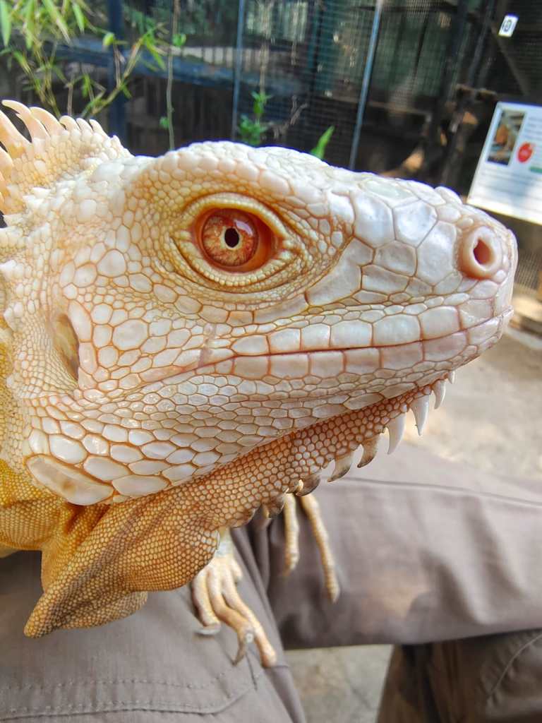 Other Considerations: Albino green iguanas can be prone to certain health issues, including respiratory infections, parasitic infestations, and poor nutrition (sometimes reaching to the food is a challenge for them!). It is important to provide a balanced diet that includes a variety of leaves, fresh fruits, and vegetables. The enclosure should be cleaned regularly to prevent the buildup of bacteria and parasites. It is also important to monitor the iguana for signs of illness, such as lethargy, loss of appetite, or difficulty breathing.