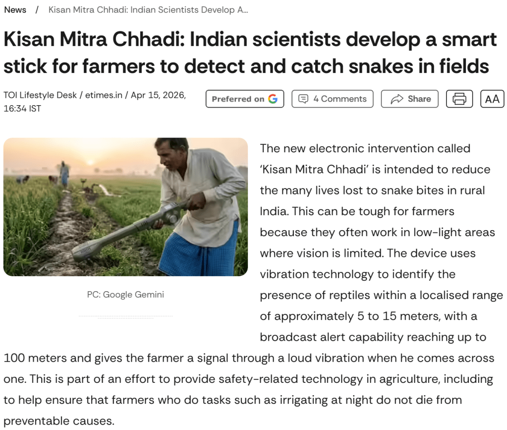 The latest entrant is the so-called Kisan Mitra Chhadi, a “smart” stick being promoted as a way to help farmers detect snakes in fields and avoid bites. Which would, of course, be very useful — if it were true in the way such headlines want readers to believe it is. The difficulty begins early. Public reporting around the device is already inconsistent. One version talks about detection within 5 to 15 metres. Another stretches things to 100 metres. Elsewhere the language drifts between detecting, alerting, protecting, and in some places practically implies some sort of anti-snake wizardry on a stick. One would imagine that if human safety is the theme, the claim should at least manage the dignity of remaining the same from one report to the next. It has not.